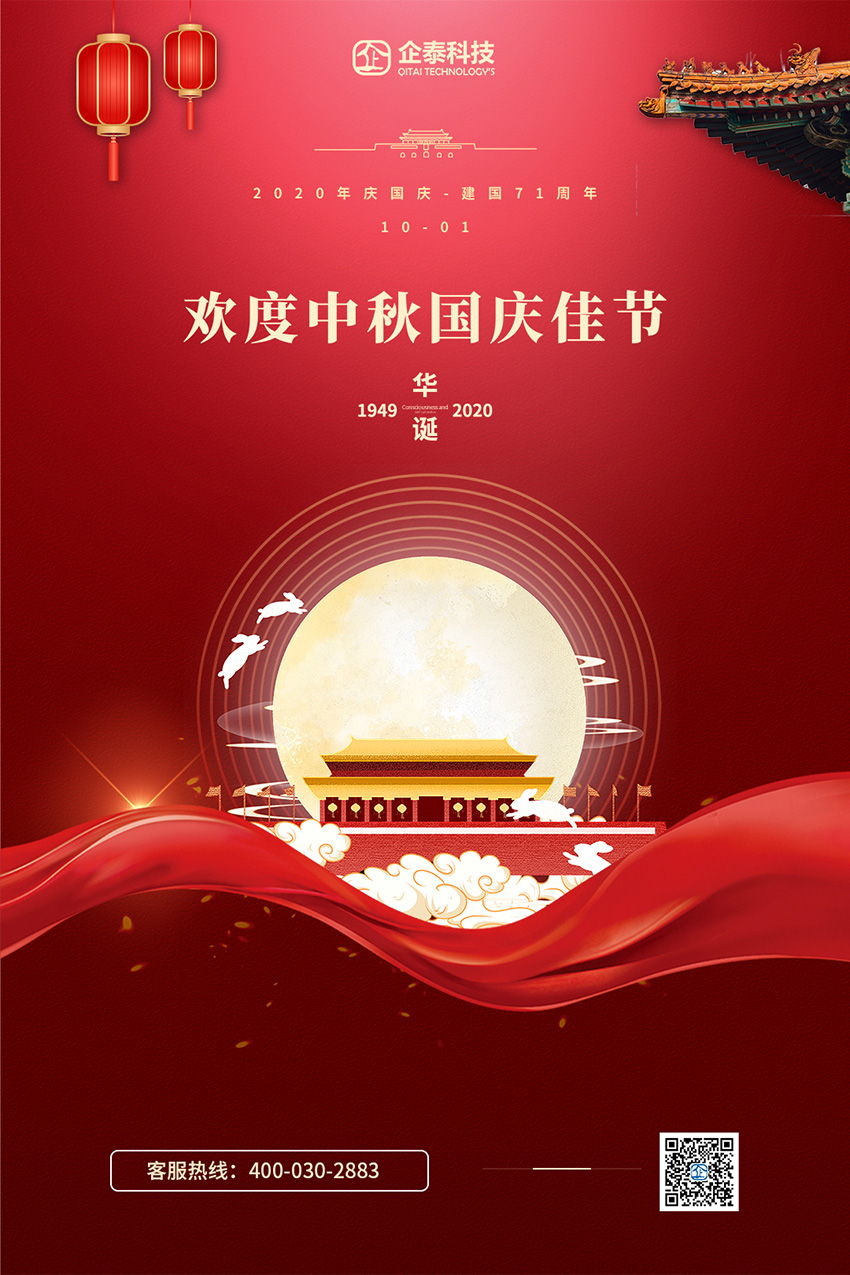 欢度中秋国庆佳节 2020-10-01 来自:企泰科技 关键词:中秋节/国庆节, 广州企泰信息科技有限公司专注于互联网应用方面相关产品的研发和服务。主营业务:全网营销网站,系统搭建,小程序,企业邮箱,域名,商城等;我们为客户提供针对性的解决方案,帮助客户解决问题。详情请关注网址:www.webqt.cn电话:400-030-2883地址:广州市越秀区先烈中路76号中侨大厦18楼 售前微信 售后微信售前QQ:2830435564售后QQ:34085183433378234109