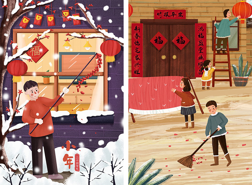 扫尘”就是年终大扫除,家家户户这 天都要打扫环境,清理各种器具,拆洗 被褥窗帘,洒扫六闾庭院,掸拂尘垢蛛 网,疏浚明渠暗沟。