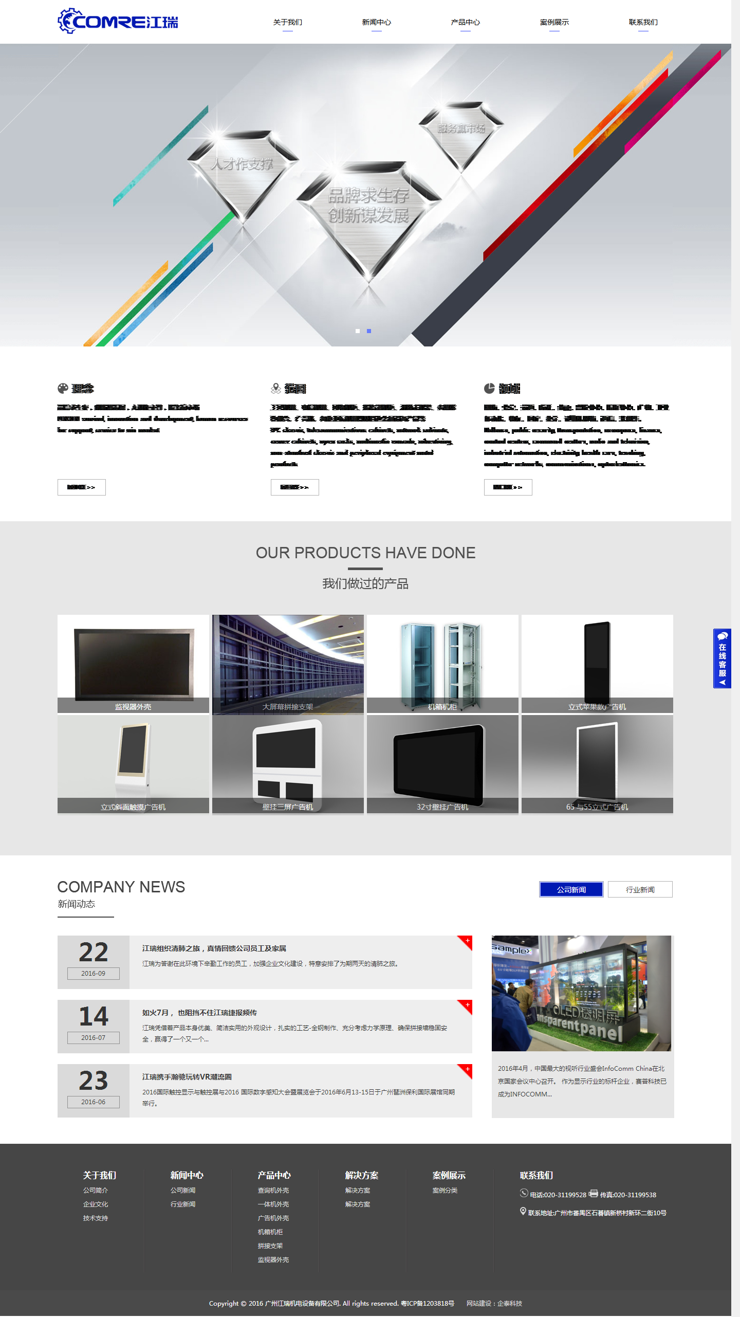 江瑞机电设备有限公司一直专注于五金机电设备制造,公司产品线丰富、经营范围广,产品涵盖有:工控机箱、电信机箱、网络机柜、服务器机柜、开放式机架、多媒体控制台、广告机、各种非标机箱以及周边金属设备产品等。