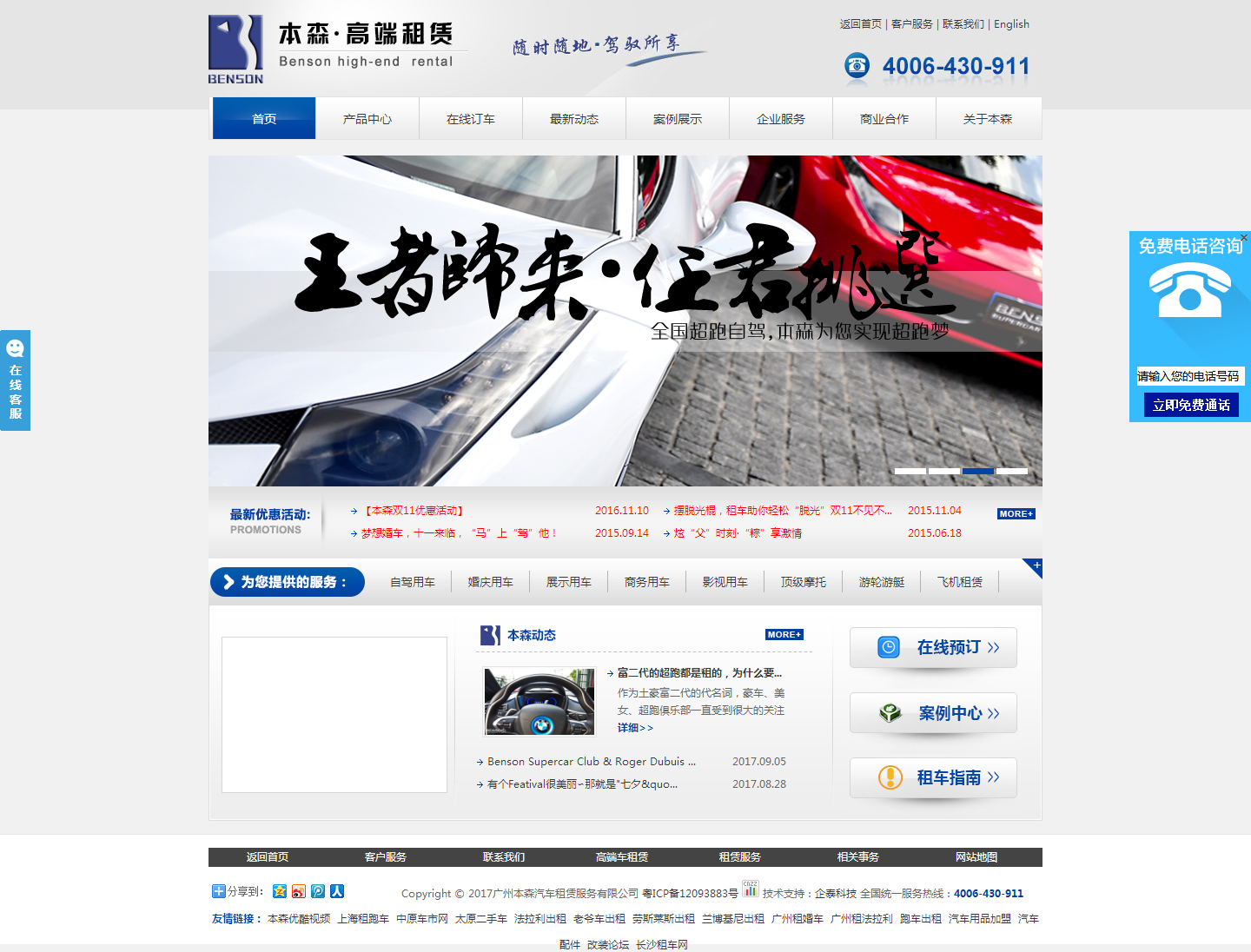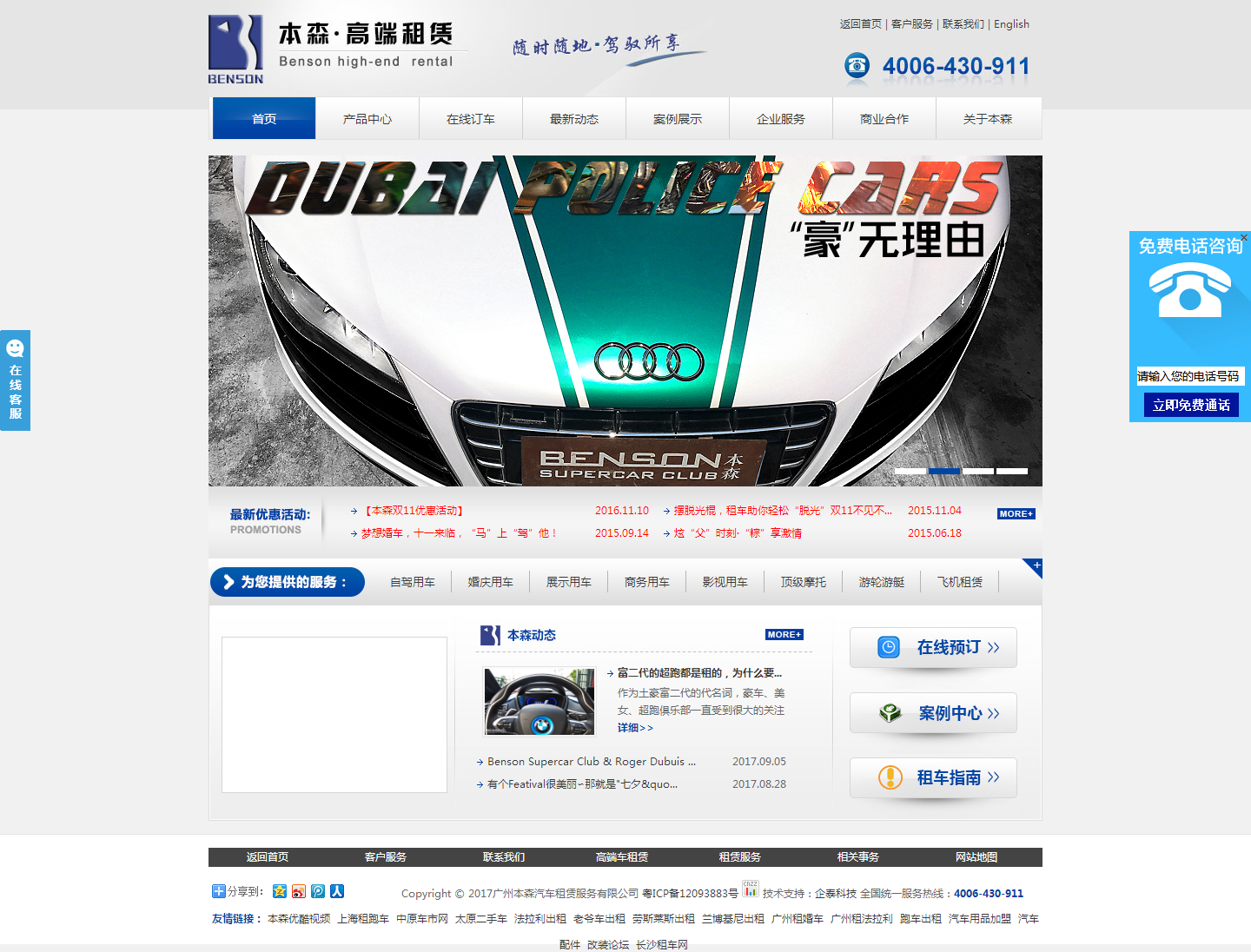 广州本森汽车租赁服务有限公司 2017-09-22 来自: 关键词: 广州本森汽车租赁服务有限公司,是一家提供世界顶级跑车、高端轿车、高级商务车、豪华婚车及游轮游艇等高级租赁服务的专业公司,创立于2007年,并在伤害、背景、广州、深圳设立公司,业务营运范围触及全国各个区域,提供全国性高端租赁服务。