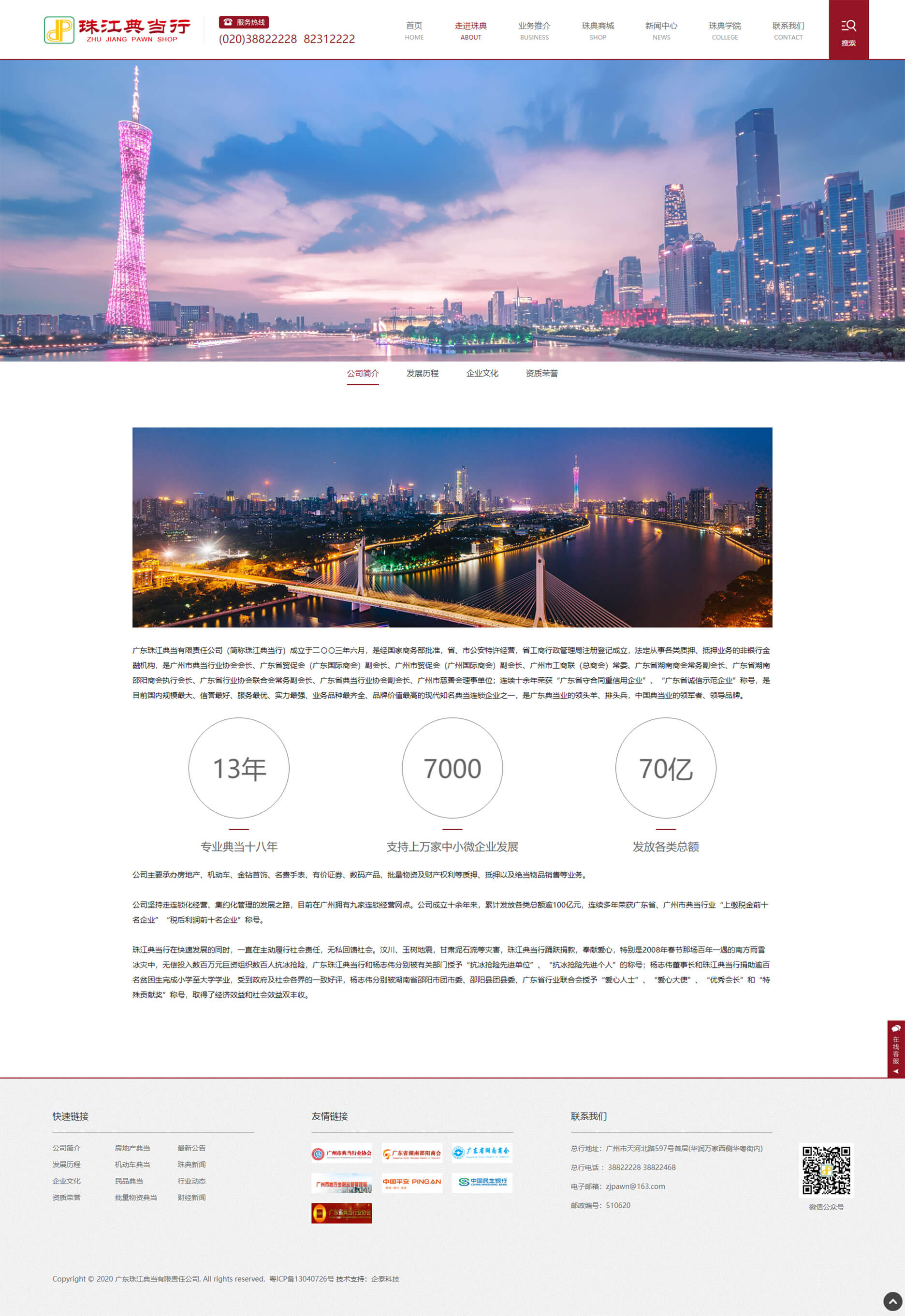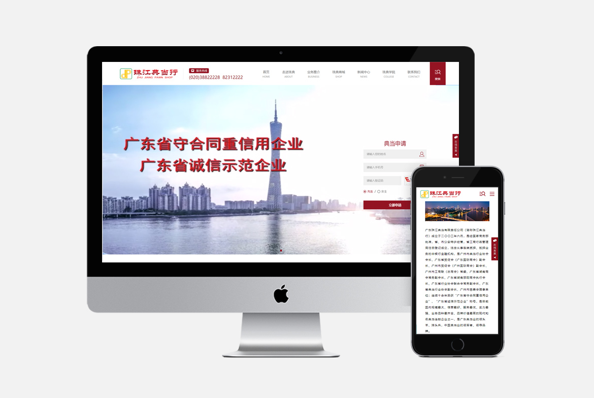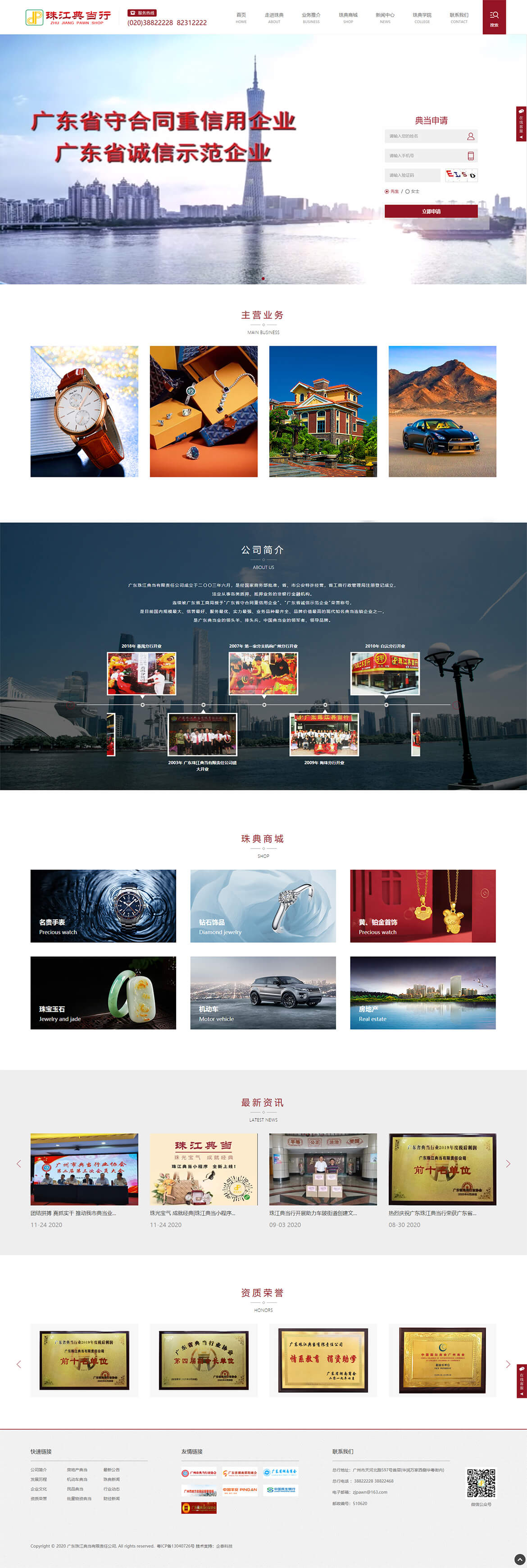 广东珠江典当有限责任公司(简称珠江典当行)成立于二〇〇三年六月,是经国家商务部批准,省、市公安特许经营,省工商行政管理局注册登记成立,法定从事各类质押、抵押业务的非银行金融机构,是广州市典当行业协会会长、广东省贸促会(广东国际商会)副会长、广州市贸促会(广州国际商会)副会长、广州市工商联(总商会)常委、广东省湖南商会常务副会长、广东省湖南邵阳商会执行会长、广东省行业协会联合会常务副会长、广东省典当行业协会副会长、广州市慈善会理事单位;连续十余年荣获“广东省守合同重信用企业”、“广东省诚信示范企业”称号,是目前国内规模最大、信誉最好、服务最优、实力最强、业务品种最齐全、品牌价值最高的现代知名典当连锁企业之一,是广东典当业的领头羊、排头兵,中国典当业的领军者、领导品牌。