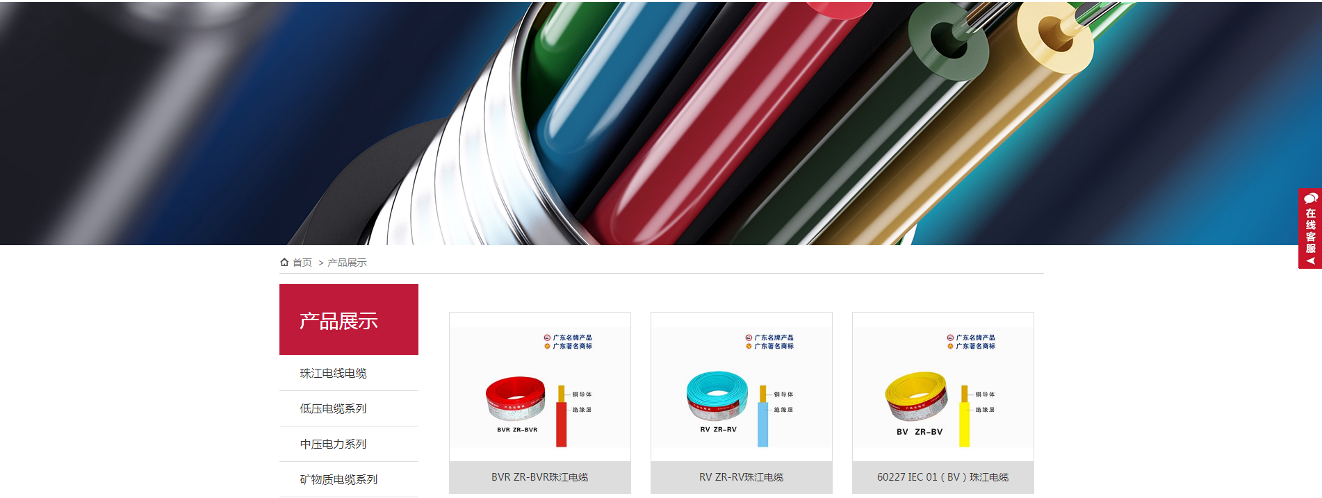 广州珠江电缆有限公司生产和销售的珠江电缆主要有:35kV及以下电力电缆、控制电缆、阻燃电缆、耐火电缆、矿物质绝缘电缆、柔性防火电缆、屏蔽电缆、分支电缆及低压电线,通信、信号线,低烟低(无)卤电线电缆、耐高温、防水等几十种系列,上千个规格。产品严格执行国际标准(IEC)、国家标准(GB)和机械部标准(JB),实行严格的过程检测和苛刻的出厂检测,产品通过中国国家强制性CCC认证,并荣获“广东省著名商标” 、“广东省重合同守信用企业”、“全国消费者公认满意产品” 、“中国名牌产品”、“工程建设首选产品”、“中国驰名品牌”等荣誉。