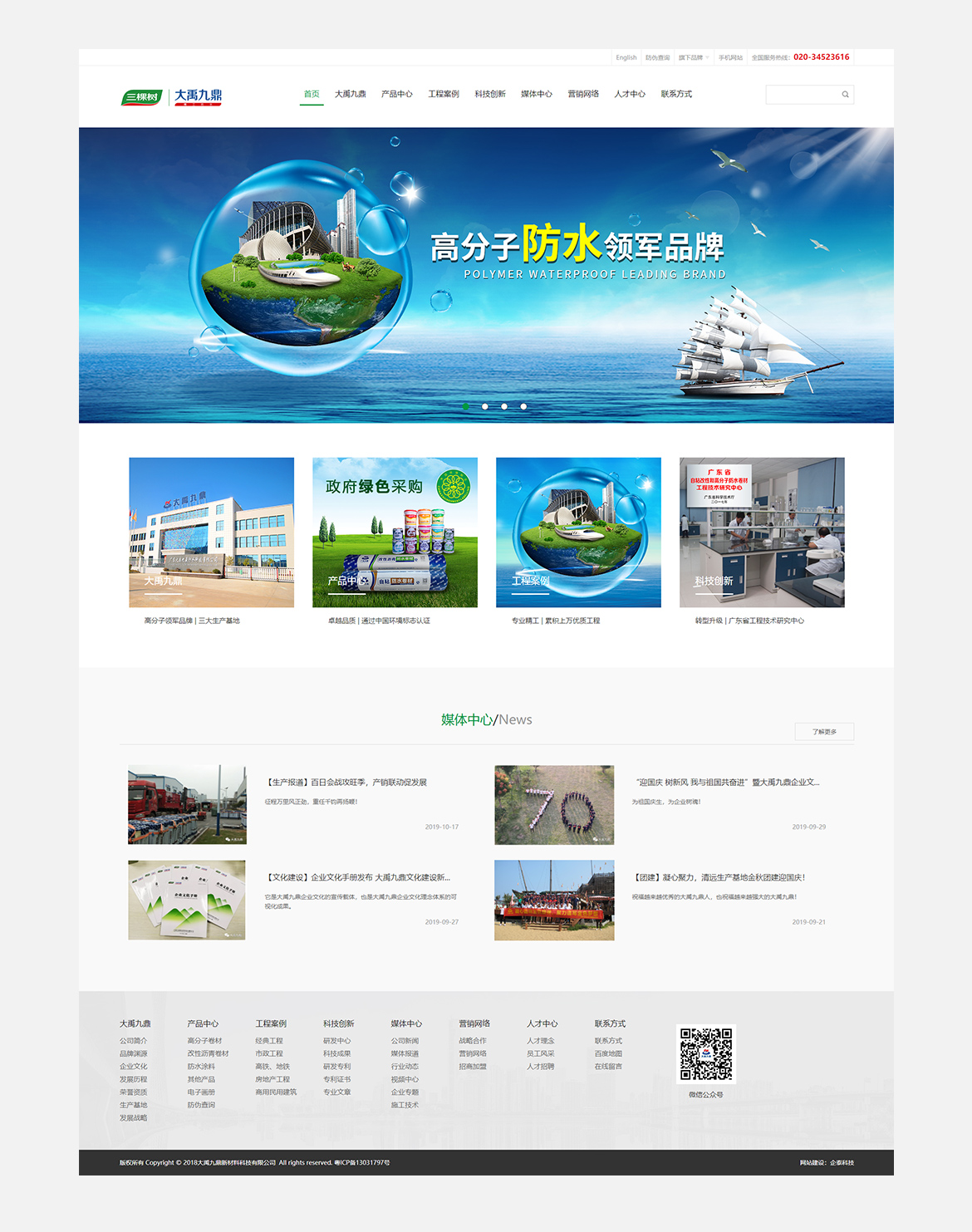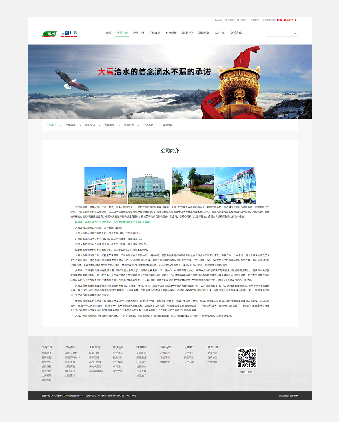 大禹九鼎是一家集研发、生产、销售、施工、技术服务于一体的大型防水系统集团化公司。公司于1995年进入建筑防水行业,是国内最早的一批老牌专业防水系统服务商,国家高新技术企业,中国建筑防水科技先锋企业,国家防水防腐保温专业承包一级资质企业,广东省自粘改性和高分子防水卷材工程技术研究中心。大禹九鼎是市政工程领域的防水翘楚,同时也是中国房地产开发企业500强首选供应商、中国十大房地产优秀供应商品牌;碧桂园等地产巨头优秀合作供应商,目前公司有八大生产基地,是国内具规模和影响力的防水企业。