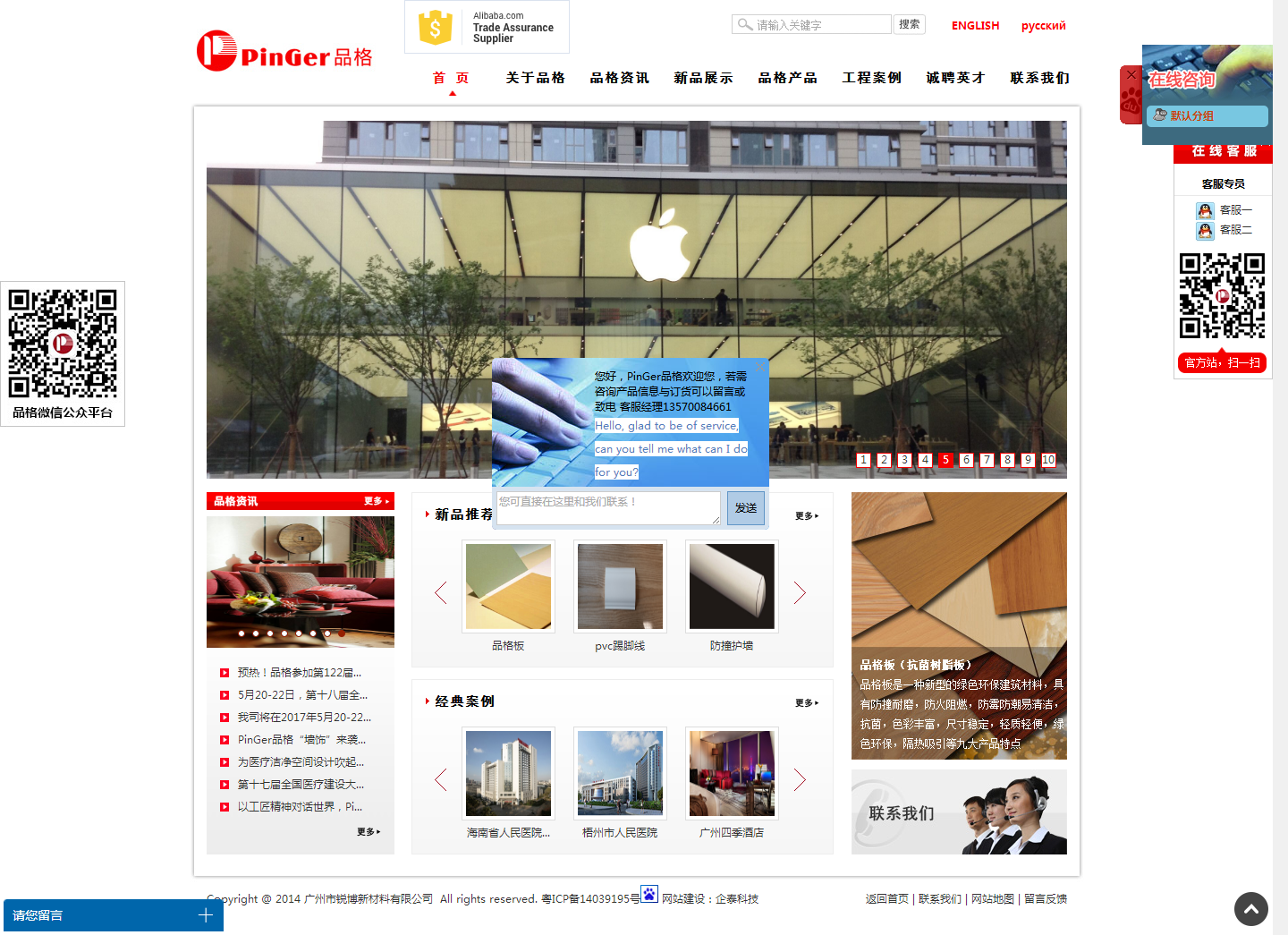 广州市锐博新材料有限公司 2017-09-22 来自: 关键词: 广州市锐博新材料有限公司是专业从事高品质环保墙面饰材及天花饰材的全球领先制造商。十五年来,我们拥有广州和湖北两个生产基地,合作设立了多个尖端开发实验室,并且特设了建筑墙面保护工程事业部,为客户提供更加完善的墙面系统解决方案。2013年,广州品格树脂科技有限公司成立,专业研发打造顶级墙面保护的树脂装饰板及树脂天花板,并在美国纽约设立办事处,全面进驻美国市场。品格正式在全球市场树立了品质、绿色、专业的品牌形象。广州市锐博新材料有限公司 pinger.cn