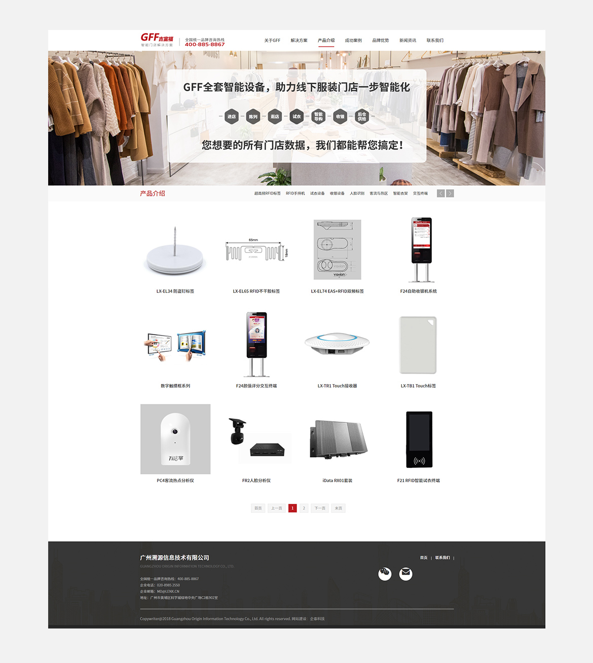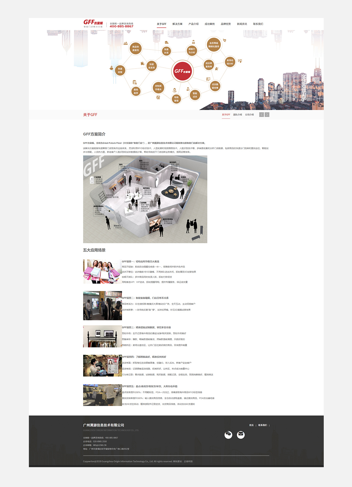 GFF吉富福,全称为Great Future Floor(中文简称“智能门店”),是广州溯源信息技术有限公司最新推出的智能门店解决方案。 该解决方案能够快速兼容门店现有供应链体系,灵活利用RFID标识技术、人型轮廓和视频跟踪技术、人脸识别技术等,多维度收集和分析门店数据,包括商品的快速分门别类和查找定位,智能试衣与搭配,人流热力图,新老客户人脸识别和试衣数据统计等,帮助传统线下门店创新业务模式,提高运营效率。