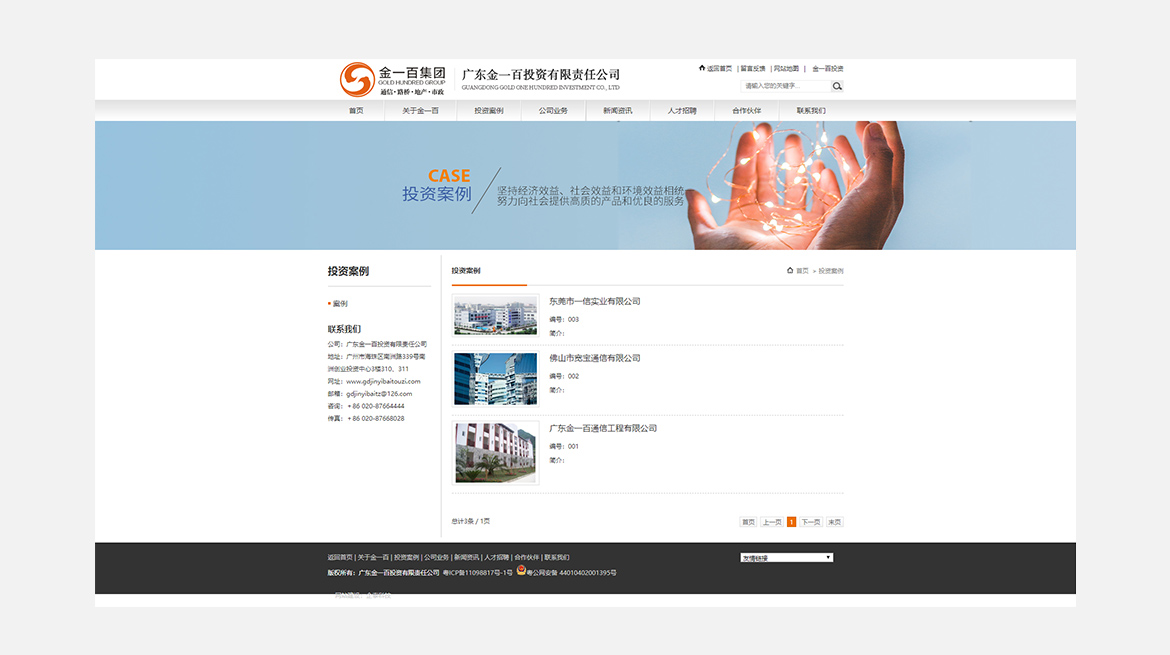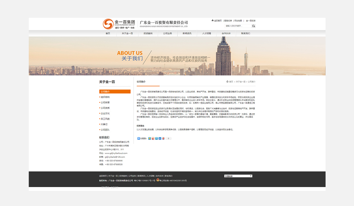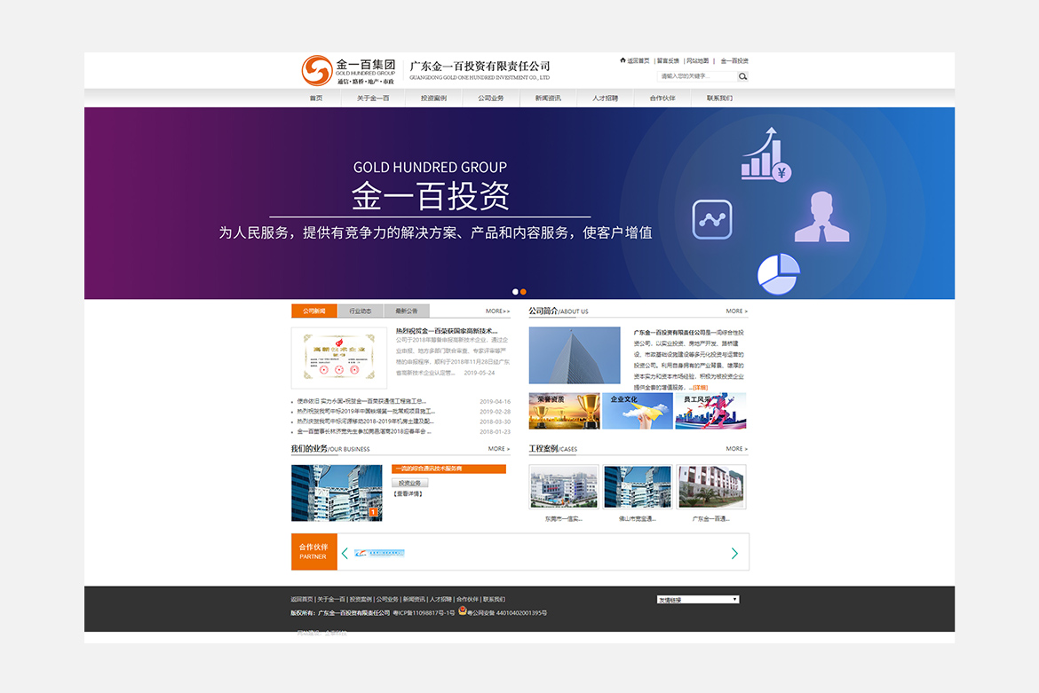 广东金一百投资有限责任公司是一间综合性投资公司,以实业投资、房地产开发、路桥建设、市政基础设施建设等多元化投资与运营的投资公司。广东金一百投资致力于投资具有良好成长性的中小企业,利用自身拥有的产业背景、雄厚的资本实力和资本市场经验,积极为被投资企业提供全套的增值服务,提升企业的盈利能力及管理水平,最终帮助企业进入资本市场。自创立至今,通过引进专业的投资管理团队并与其他知名私募股权投资机构进行战略合作,已完成若干个项目的股权投资,如:东莞市一信实业有限公司,佛山市宽宝通信有限公司,广东金一百通信工程有限公司。