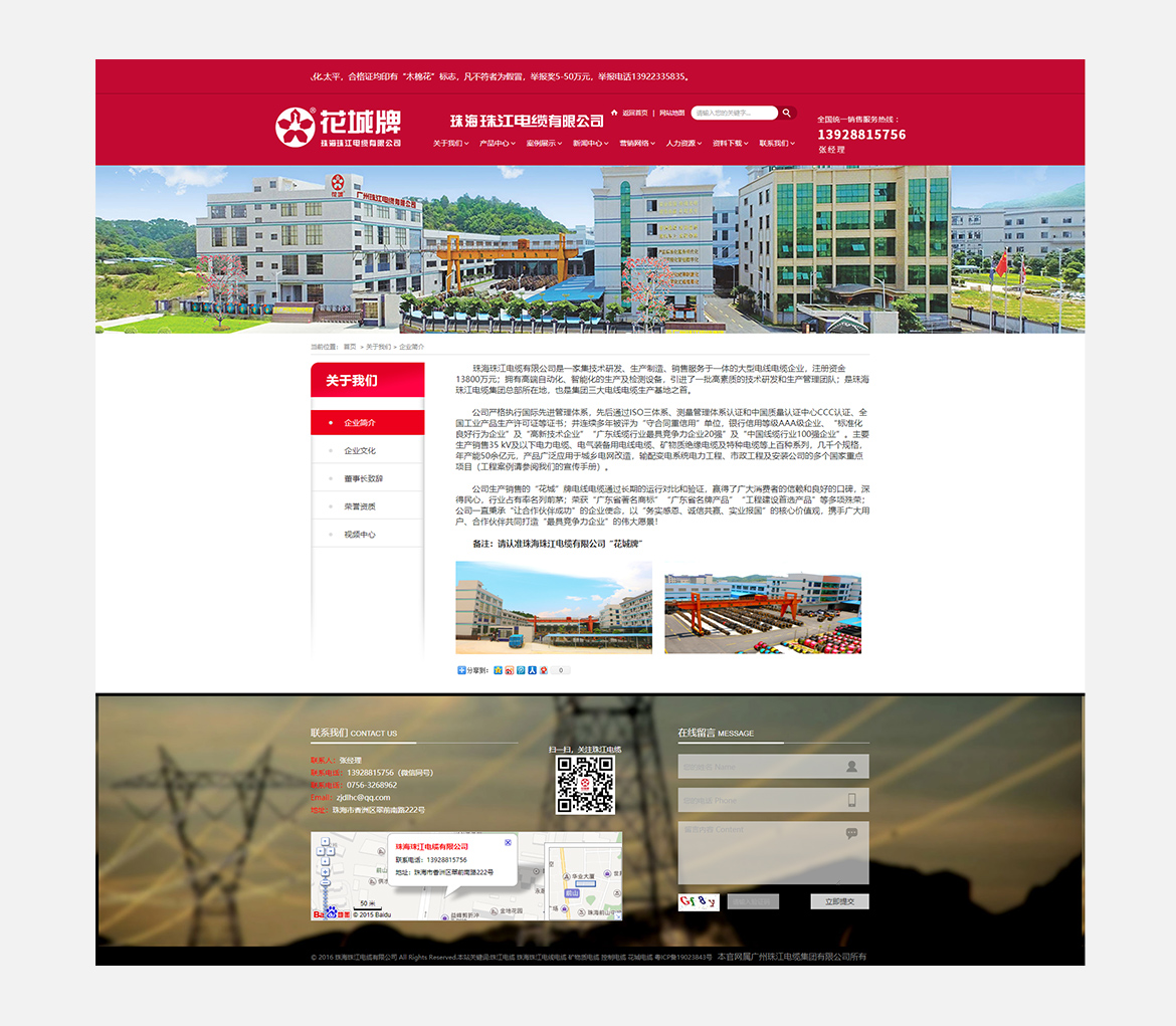 是一家集技术研发、生产制造、销售服务于一体的大型电线电缆企业,注册资金13800万元;拥有高端自动化、智能化的生产及检测设备,引进了一批高素质的技术研发和生产管理团队;是珠海珠江电缆集团总部所在地,也是集团三大电线电缆生产基地之首。公司一直秉承“让合作伙伴成功”的企业使命,以“务实感恩、诚信共赢、实业报国”的核心价值观,携手广大用户、合作伙伴共同打造“最具竞争力企业”的伟大愿景!
