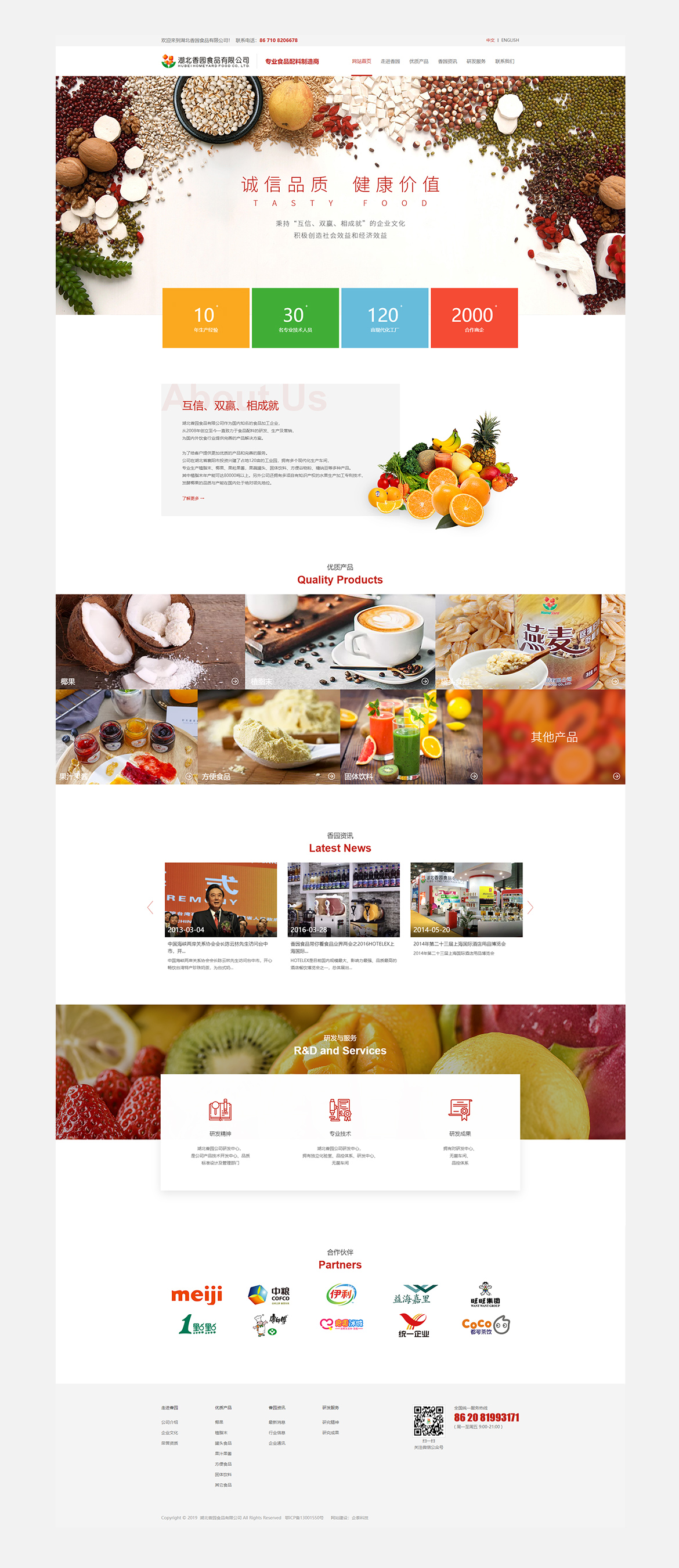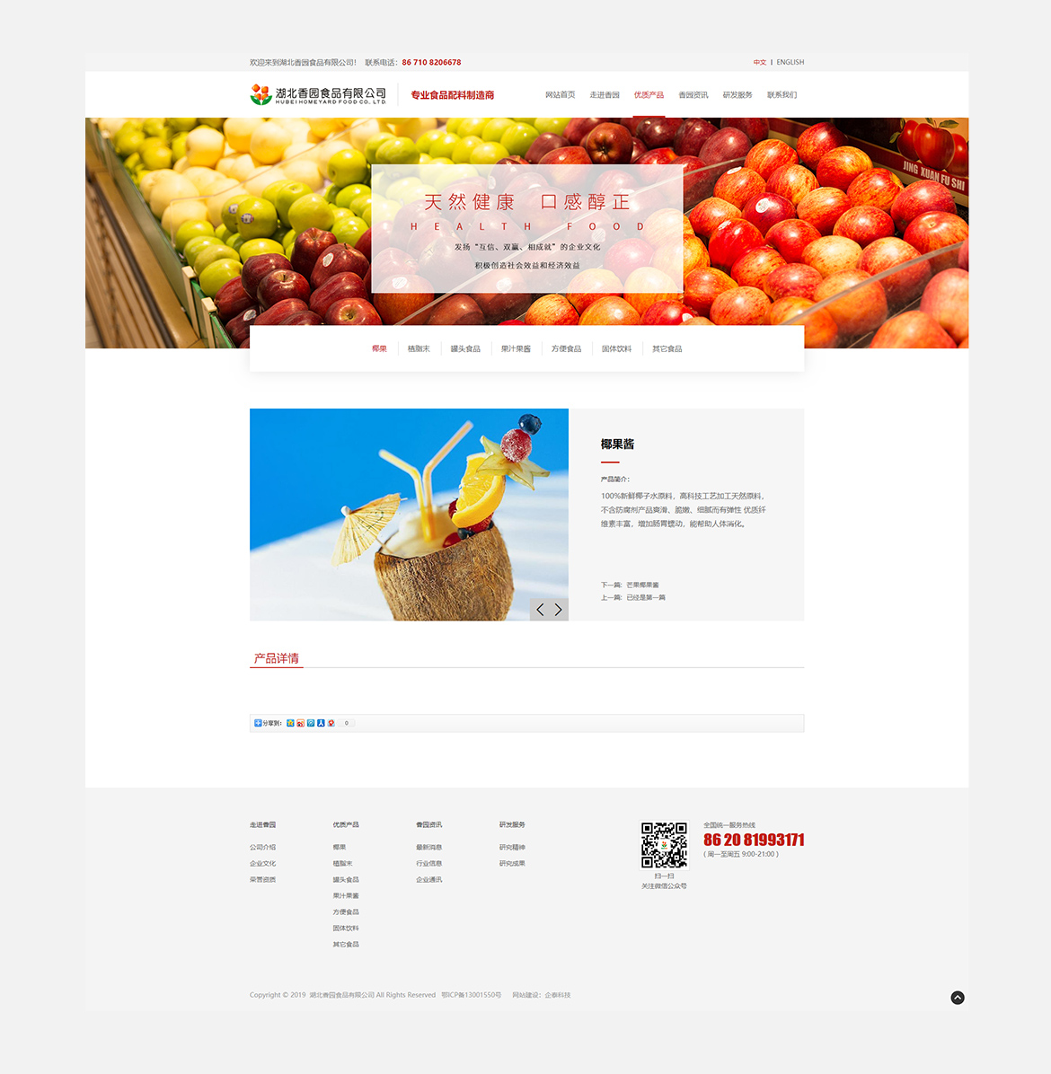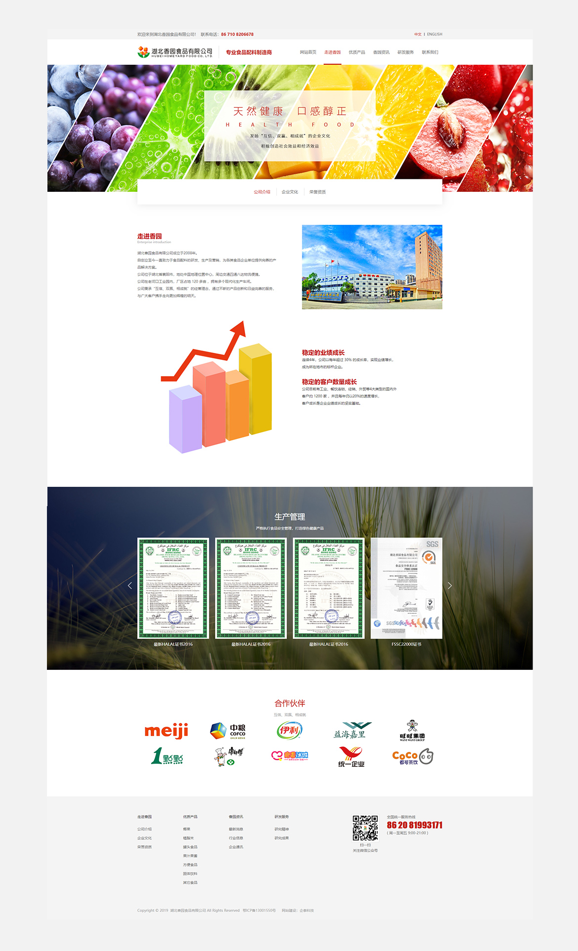 湖北香园食品有限公司作为国内知名的食品加工企业,从2008年创立至今一直致力于食品配料的研发、生产及营销,为国内外饮食行业提供完善的产品解决方案。为了给客户提供更加优质的产品和完善的服务。公司在湖北省襄阳市投资兴建了占地120亩的工业园,拥有多个现代化生产车间,专业生产植脂末、椰果、果粒果酱,果蔬罐头、固体饮料、方便谷物粉、糖纳豆等多种产品。其中植脂末年产能可达80000吨以上。另外公司还拥有多项自有知识产权的水果生产加工专利技术,发酵椰果的品质与产能在国内处于绝对领先地位。