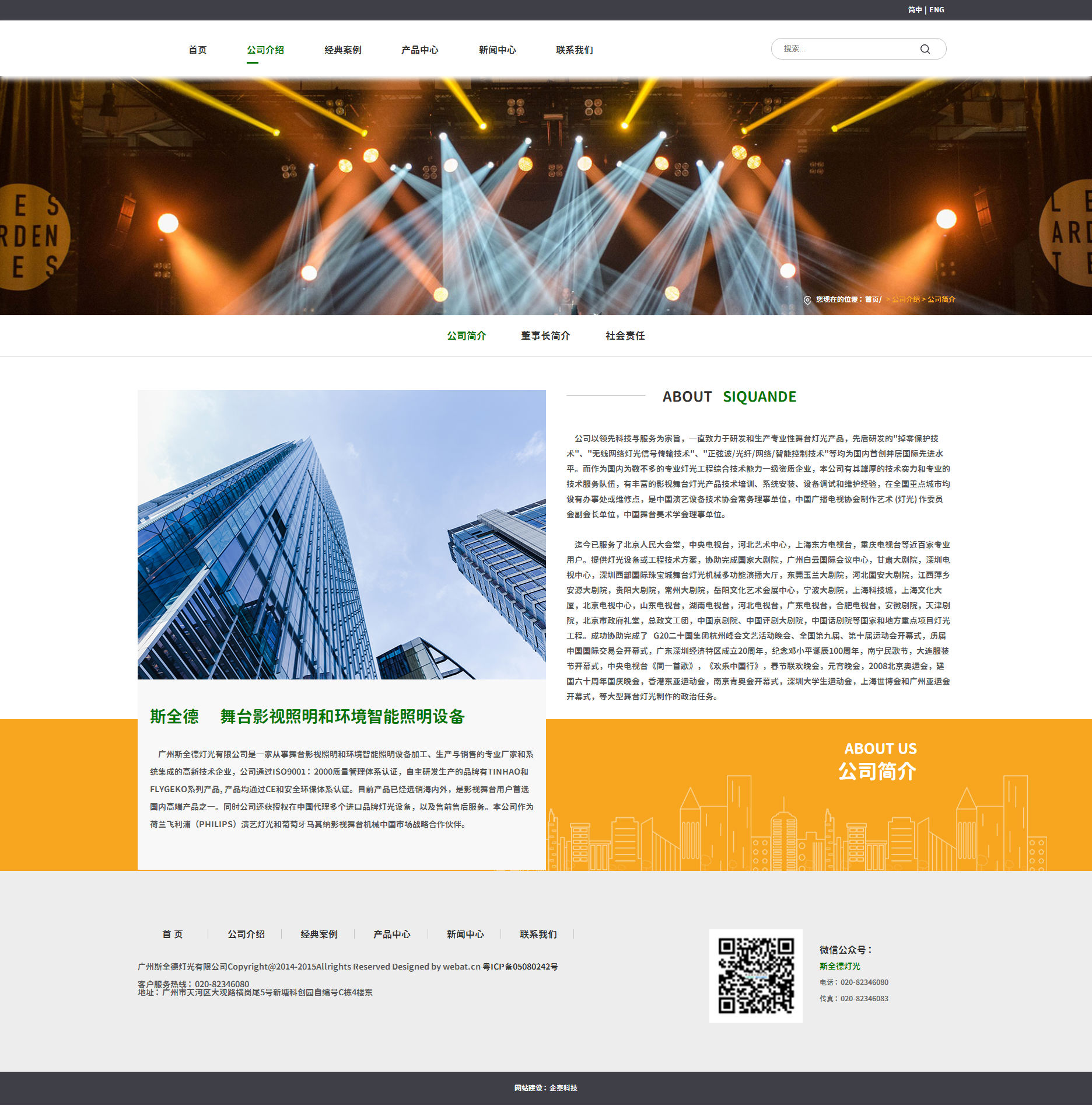 广州斯全德灯光有限公司是一家从事舞台影视照明和环境智能照明设备加工、生产与销售的专业厂家和系统集成的高新技术企业,公司通过ISO9001:2000质量管理体系认证,自主研发生产的品牌有TINHAO和FLYGEKO系列产品, 产品均通过CE和安全环保体系认证。目前产品已经远销海内外,是影视舞台用户首选国内高端产品之一。同时公司还获授权在中国代理多个进口品牌灯光设备,以及售前售后服务。