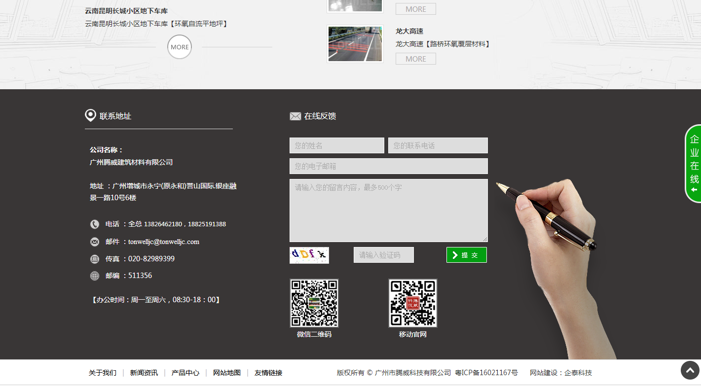 广州腾威科技有限公司 2017-09-25 来自: 关键词: 广州腾威科技集团源于成立于2005年的广州宏信行化工有限公司及2008年成立的广州腾威科技有限公司,我司集代理、研发、合作、生产于一体,致力于绿色建材的研发与应用推广。 我司主营产品固瑞达(Greenphalt)是美国最悠久的路桥材料品牌,在欧洲和美洲是“环保、绿色的路面覆层材料”的代名词,拥有30年的应用历史,由美国亨斯迈公司提供专利,生产享誉全球的路桥材料。